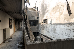 L’intero complesso ha il suo fulcro in ciò che resta dell’imponente chiesa di S. Maria in Gradi, fondata nella seconda metà del Duecento. Il toponimo del luogo suggerisce che la chiesa fu caratterizzata sin dall’origine da una scalinata di ingresso (“ad gradus”). Rimaneggiata alla fine del Quattrocento e poi radicalmente ricostruita alla metà del Settecento, ad opera dell’architetto romano Nicola Salvi, autore anche della Fontana di Trevi, ha subìto evidenti danneggiamenti imputabili ai bombardamenti, al crollo del tetto in seguito alle abbondanti nevicate dell’inverno del 1956 e allo stato di abbandono durante il periodo in cui l’intero complesso fu convertito in carcere (1873-1993).