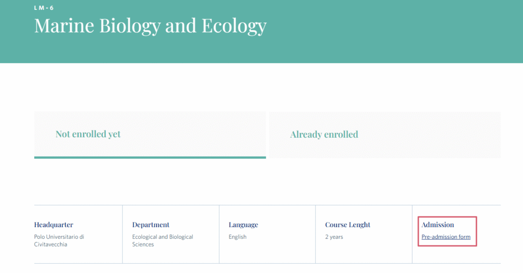 Gli studenti internazionali (sia UE che extra-UE) che intendono iscriversi, per l’a.a. 2025/26, al corso di Laurea magistrale in Marine Biology and Ecology (LM-6), devono compilare il form presente all’interno della pagina del corso di laurea. Si informa che le iscrizioni sono chiuse per gli studenti provenienti da Paesi extra-UE. Gli studenti dell’Unione Europea interessati a iscriversi al corso sono pregati di contattare m.pasqual@unitus.it.