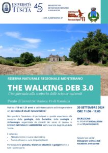 Lunedì 30 settembre 2024 il Dipartimento di Scienze Ecologiche e Biologiche (DEB) dell’Università degli Studi della Tuscia organizzerà una giornata alla scoperta delle scienze naturali nella Riserva Naturale Monterano (Canale Monterano, RM). La partenza è prevista per le 11:00 dalla stazione FS di Manziana (RM), da cui i partecipanti saranno trasportati con un pullman GT alla riserva, dove saranno accolti dal personale del parco. Il ritorno è programmato per le 17:00.