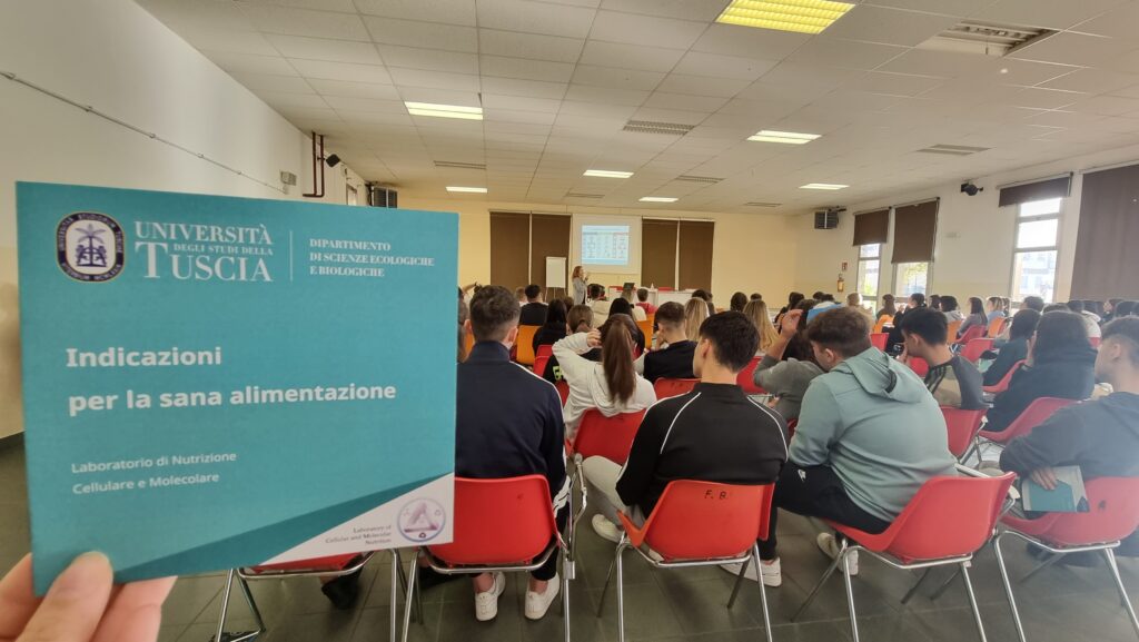 Scuole superiori: Seminari della durata di circa un’ora, rivolti principalmente agli studenti delle classi terze, quarte e quinte, con la presentazione delle linee guida e la distribuzione di un opuscolo cartaceo, concepito come un vademecum utile per persone di tutte le età e condizioni di salute, che gli studenti potevano condividere con le famiglie. Inoltre, venivano presentati i corsi di laurea del Dipartimento di Scienze Ecologiche e Biologiche (DEB) volti alla formazione di biologi nutrizionisti, in particolare i corsi L-13 (Scienze Biologiche) e LM-61 (Scienze dell’Alimentazione e Nutrizione Umana), e distribuiti relativi materiali informativi. La prima edizione ha coinvolto 16 istituti situati principalmente nella provincia di Viterbo, ma anche a Roma, Frosinone, Terni e Rieti, raggiungendo circa 1650 studenti attraverso 27 seminari in presenza.