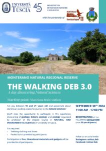 On Monday, September 30, 2024, the Department of Ecological and Biological Sciences (DEB) at the University of Tuscia will organize a day exploring natural sciences in the Monterano Nature Reserve (Canale Monterano, RM). Departure is scheduled for 11:00 AM from the Manziana (RM) train station, from which participants will be transported by a coach to the reserve, where they will be welcomed by park staff. The return is planned for 5:00 PM.