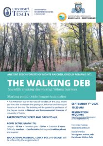 On September 7, 2023, the event “The Walking DEB: Scientific Trekking to Discover Natural Sciences” was held, organized by the professors of the Bachelor’s Degree in Natural and Environmental Sciences from the Department of Ecological and Biological Sciences (DEB) at the University of Tuscia. Around 100 people participated, double the initially expected number, and they appreciated the scientific and educational approach of the excursion, which took place in the ancient beech forest of Monte Raschio in Oriolo Romano.