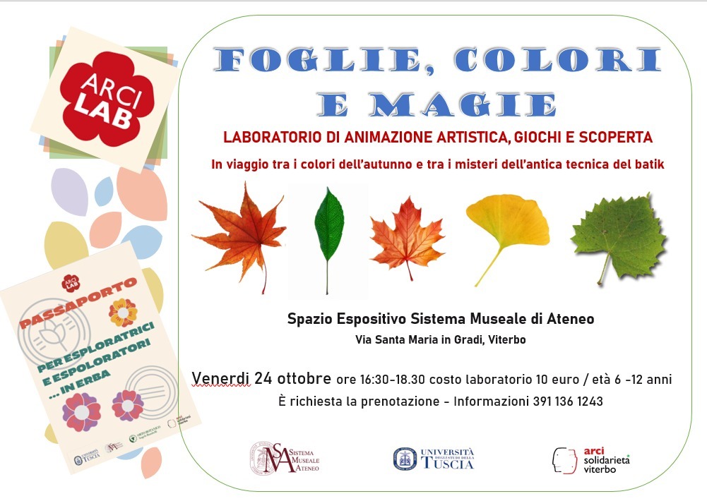 Nuovo appuntamento con il Passaporto per Esploratrice ed Esploratori in erba . Continuano gli appuntamenti per i più piccoli presso il Museo spazio SMA in S. Maria in Gradi, in collaborazione con ARCILab. Vi aspettiamo venerdì 24 alle ore 16,30 con il laboratorio ” Foglie, colori e magie “.