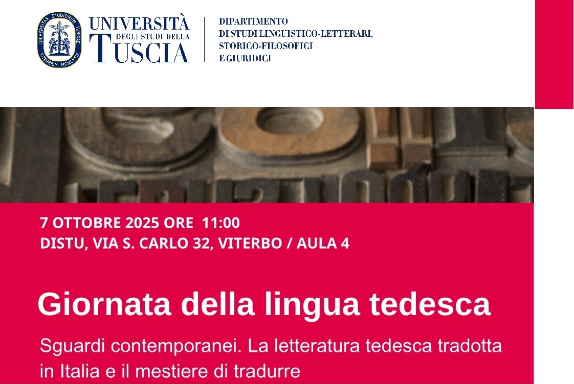 In occasione della giornata della lingua tedesca, Marco Federici Solari, traduttore e fondatore, insieme a Lorenzo Flabbi, della casa editrice L’Orma Editore, terrà un intervento sulle voci più rappresentative della letteratura tedesca contemporanea e sulla traduzione editoriale.   L'evento si svolgerà il 7 ottobre in Aula 4 (San Carlo), dalle 11:00 alle ore 13:00.   Per informazioni: giovanni.palilla@unitus.it Locandina
