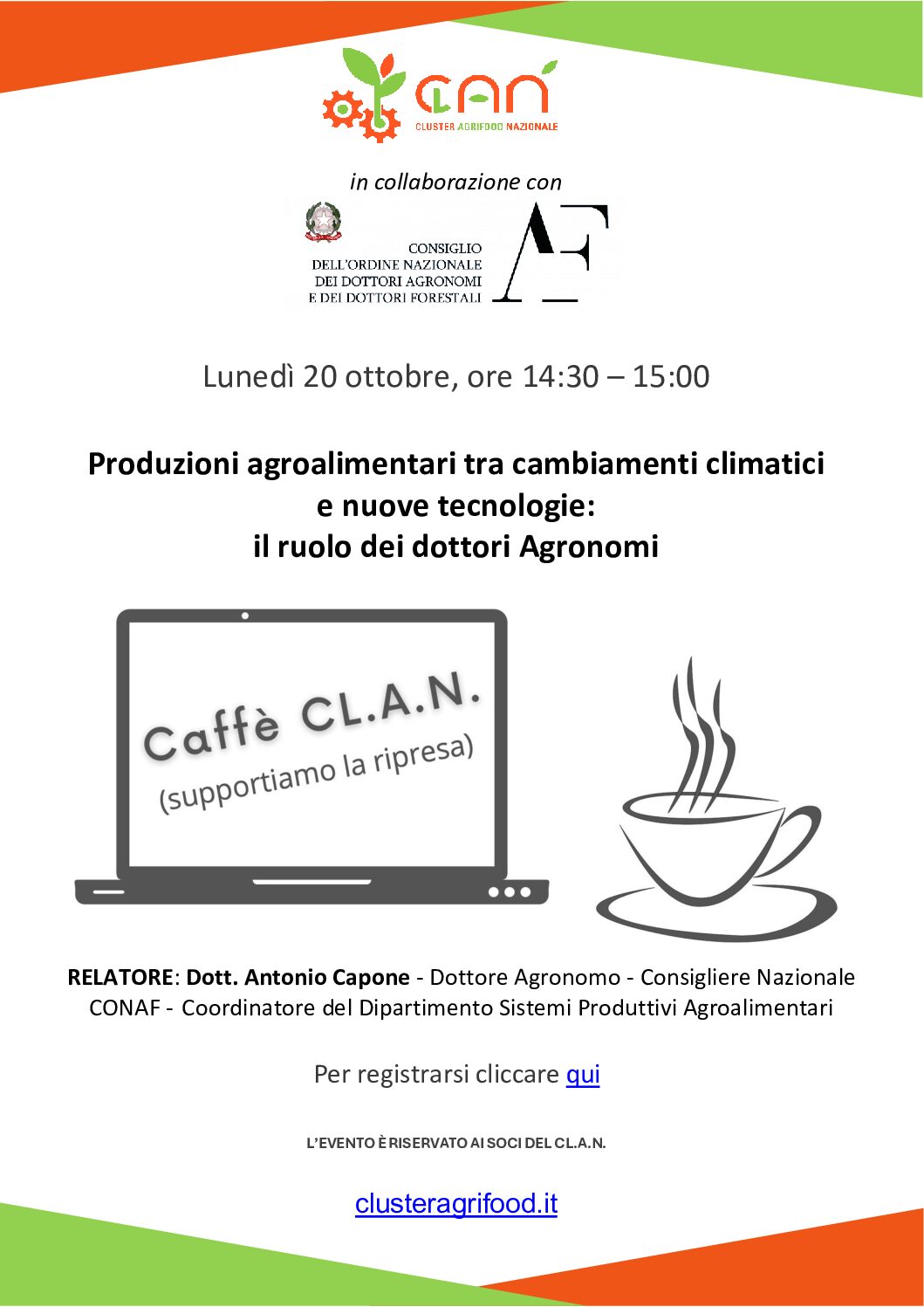 Gentili Soci, proseguono gli incontri di informazione del Cluster CL.A.N. dedicati ai temi di attualitร del settore agroalimentare. Con la presente siamo lieti di invitarvi al prossimoย appuntamentoย delย โCaffรจย CL.A.N.โ, organizzato con il supporto delย Consiglio dellโOrdine Nazionale dei Dottori Agronomi e Forestali (CONAF),ย che si terrร ย onlineย lunedรฌ 20 ottobreย dalle 14.30 alle 15.00,ย avente come titolo e tema:ย "Produzioni agroalimentari tra cambiamenti climatici […]