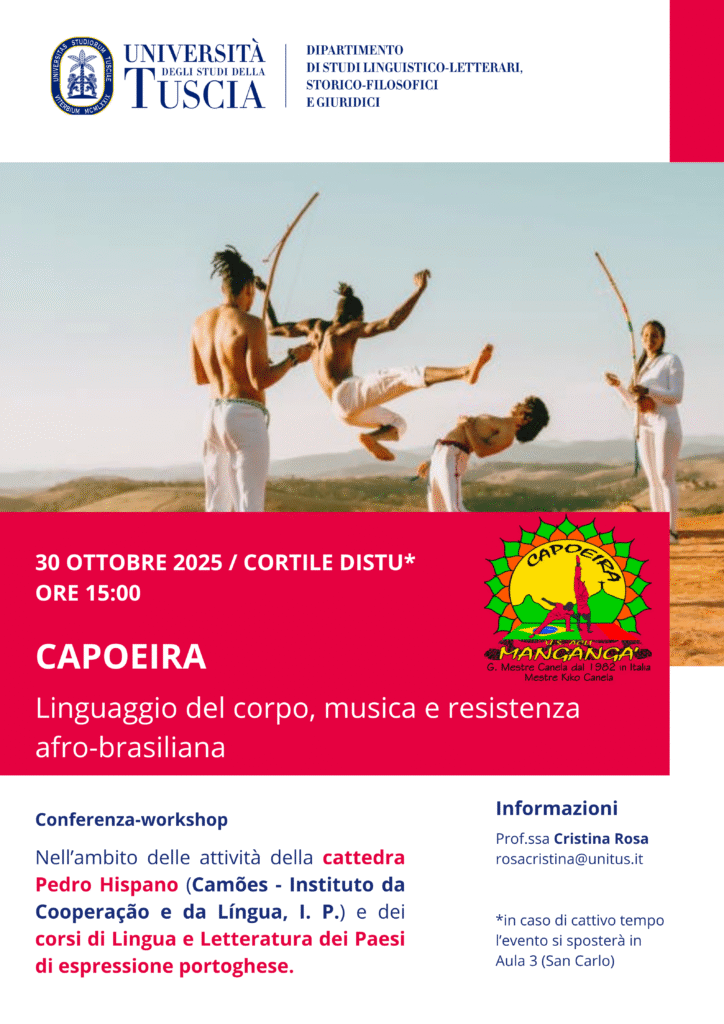 Il 30 ottobre 2025, alle ore 15:00, presso il cortile del DISTU, si svolgerร  la conferenza-workshop ๐‚๐š๐ฉ๐จ๐ž๐ข๐ซ๐š. ๐‹๐ข๐ง๐ ๐ฎ๐š๐ ๐ ๐ข๐จ ๐๐ž๐ฅ ๐œ๐จ๐ซ๐ฉ๐จ, ๐ฆ๐ฎ๐ฌ๐ข๐œ๐š ๐ž ๐ซ๐ž๐ฌ๐ข๐ฌ๐ญ๐ž๐ง๐ณ๐š ๐š๐Ÿ๐ซ๐จ-๐›๐ซ๐š๐ฌ๐ข๐ฅ๐ข๐š๐ง๐š, nell’ambito delle attivitร  della cattedra Pedro Hispano (Camรตes – Instituto da Cooperaรงรฃo e da Lรญngua, I.P.) e dei corsi di Lingua e Letteratura dei Paesi di espressione portoghese.