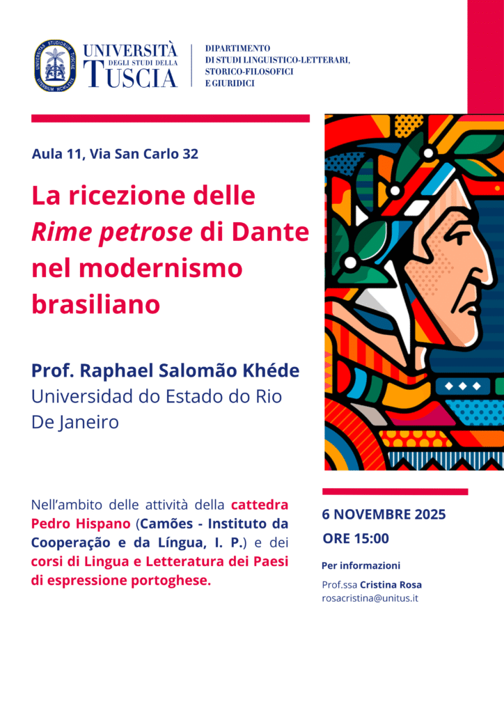 IlΒ 6 novembre 2025, alle ore 15:00, presso l’Aula 11 del San Carlo si terrΓ  il seminario delΒ del prof. 𝑹𝒂𝒑𝒉𝒂𝒆𝒍 π‘Ίπ’‚π’π’π’Žπ’‚Μƒπ’ 𝑲𝒉𝒆́𝒅𝒆 (Universidad do Estado do Rio De Janeiro), dal titolo π‹πš 𝐫𝐒𝐜𝐞𝐳𝐒𝐨𝐧𝐞 𝐝𝐞π₯π₯𝐞 π‘π’π¦πž 𝐩𝐞𝐭𝐫𝐨𝐬𝐞 𝐝𝐒 πƒπšπ§π­πž 𝐧𝐞π₯ 𝐦𝐨𝐝𝐞𝐫𝐧𝐒𝐬𝐦𝐨 π›π«πšπ¬π’π₯𝐒𝐚𝐧𝐨. L’evento rientra nell’ambito delle attivitΓ  della cattedra Pedro Hispano (CamΓ΅es – Instituto da CooperaΓ§Γ£o e da LΓ­ngua, I.P.) e dei corsi di Lingua e Letteratura dei Paesi di espressione portoghese.