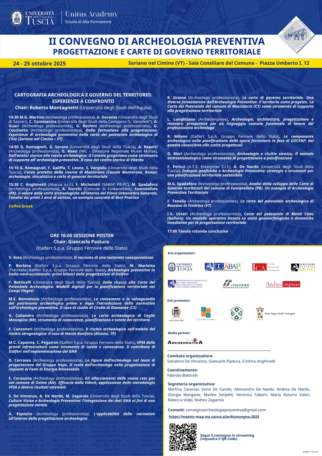 Nella sessione Poster, professionisti del settore presenteranno le proprie ricerche, esperienze e casi studio dedicati all’archeologia preventiva e alla progettazione territoriale.