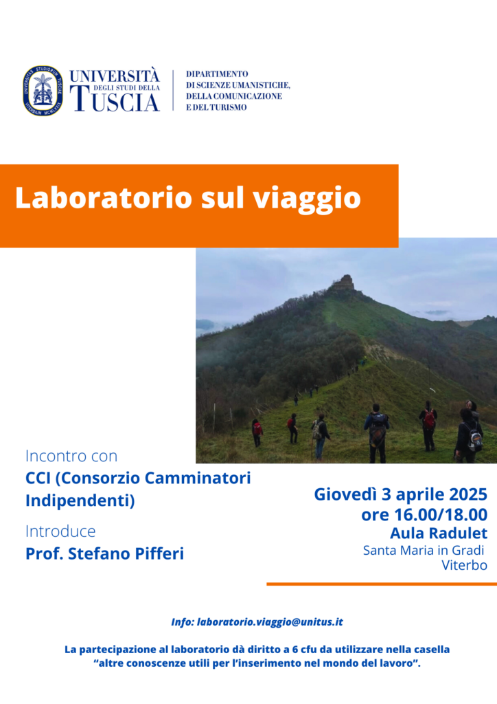 Proseguono con successo gli incontri del Laboratorio sul viaggio tenuti dal Dott. Stefano Pifferi nell’ambito del corso di laurea in Lettere Moderne. Gli incontri con giornalisti, scrittori e viaggiatori come Eraldo Affinati, Claudio Visentin della Scuola del Viaggio e Wu Ming 2 hanno toccato tematiche relative alla Tuscia come ideale spazio di attraversamento e di stratificazione memoriale, mostrando come il nostro territorio sia ricco di Storia e storie e di paesaggi, sia urbani che naturali, in alcuni casi da interpretare, in altri da (ri)scoprire che vedono nell’odeporica la modalità ideale di restituzione. Gli incontri proseguiranno in aprile in base al calendario disponibile sulla pagina del Laboratorio.