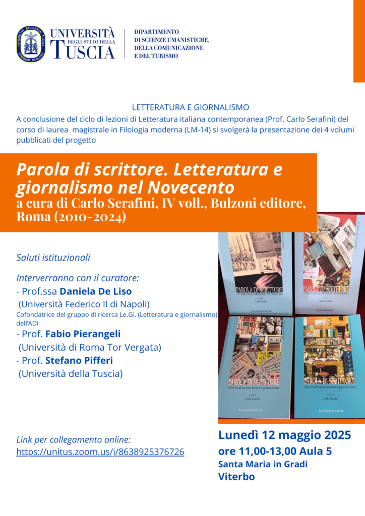 A conclusione del ciclo di lezioni di Letteratura italiana contemporanea (Prof. Carlo Serafini) del corso di laurea magistrale in Filologia moderna (LM-14) si svolgerà la presentazione dei 4 volumi pubblicati del progetto:
