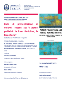 Nell’ambito del Ciclo di presentazione di volumi recenti su I poteri pubblici: la loro disciplina, la loro storia (cattedra del prof. Giulio Vesperini), si terrà la presentazione del libro di E. D’Alterio Public finance law and public administrations. The shaping power of public finance in the European Union, Routledge, 2025.