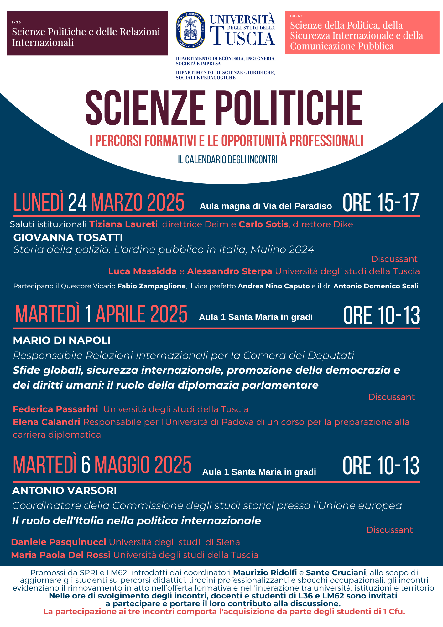 Il corso di studi triennale in Scienze politiche e delle relazioni internazionali e il corso di studi magistrale in Scienze della politica, della comunicazione pubblica e della sicurezza internazionale organizzano un ciclo di incontri dedicati a percorsi formativi e opportunità professionali per le Scienze politiche. L’iniziativa, promossa dai coordinatori Maurizio Ridolfi e Sante Cruciani, ha l’obiettivo di aggiornare la comunità studentesca sulle opportunità, in termini di percorsi didattici, di tirocini professionalizzanti e di sbocchi occupazionali, che oggi si aprono per le studentesse e gli studenti della L36 e della LM62.