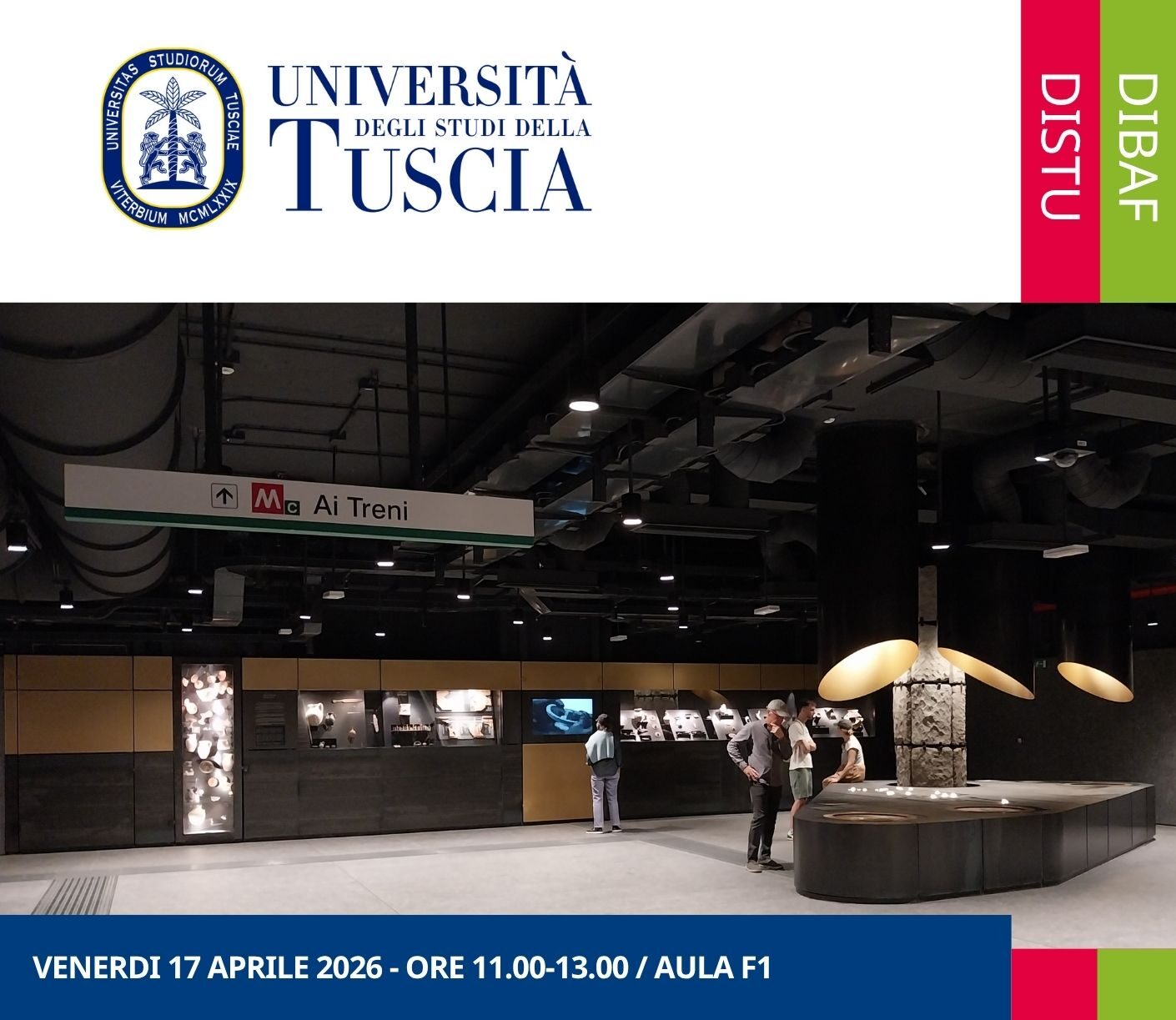 17 aprile 2026 ore 11 aula 1 Blocco F I nuovi spazi espositivi della metropolitana di Roma nelle fermate San Giovanni e Fori Imperiali-Colosseo connotano e qualificano culturalmente aree di transito offrendo uno straordinario esempio di integrazione tra infrastruttura e storia dei luoghi. Ne parleremo con l'arch.Andrea Grimaldi nell'ambito del ciclo di incontri “I mestieri […]