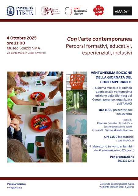 Per i più grandi si svolgerà una visita guidata alle opere della Rete dell’Arte contemporanea della Tuscia presenti in Rettorato, a cura di Vera Anelli.