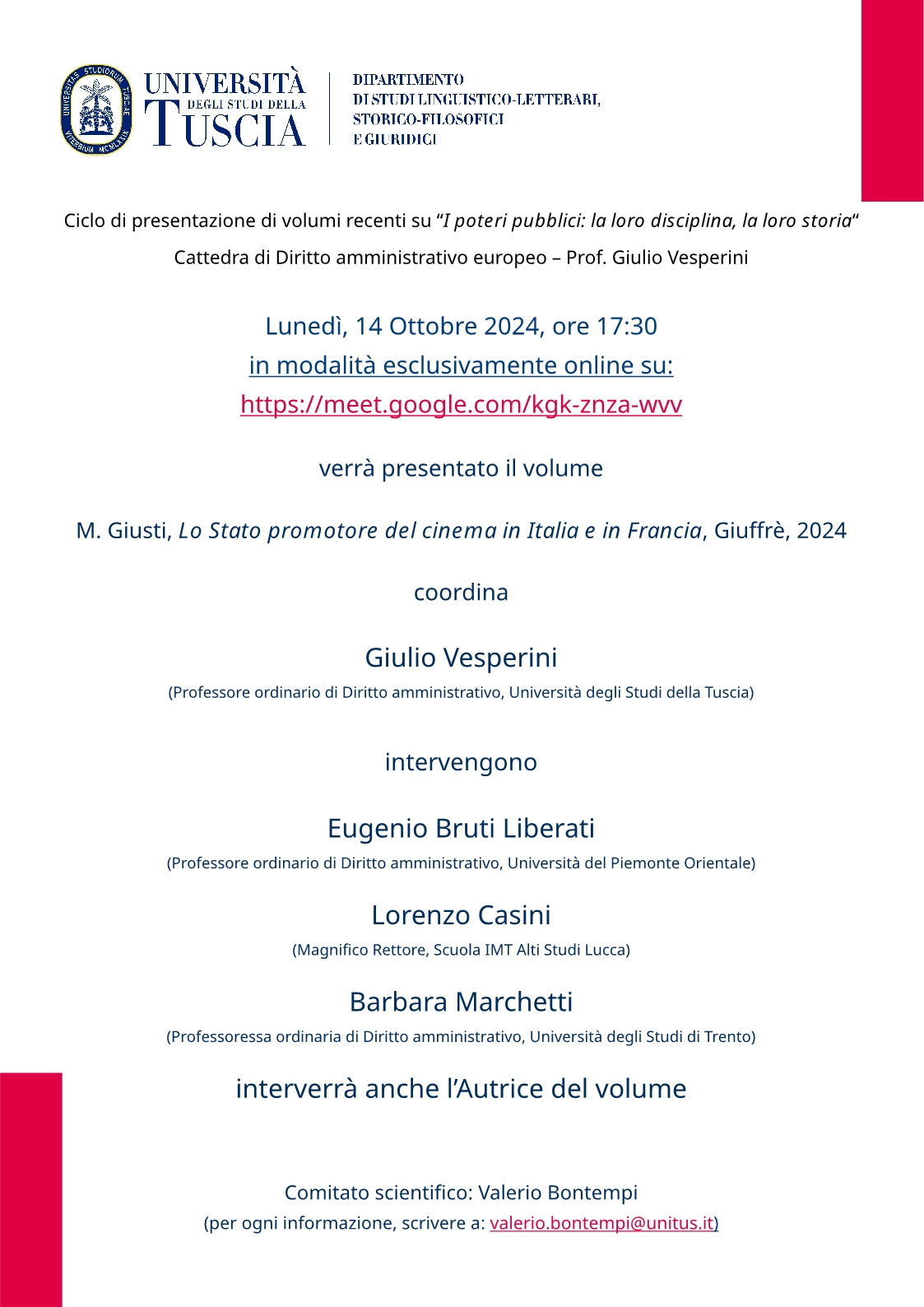 Lunedì 14 ottobre 2024, alle ore 17:30, si terrà presso l’Università degli Studi della Tuscia la presentazione del volume di M.Giusti Lo Stato promotore del cinema in Italia e in Francia, Giuffrè, 2024. L’evento, esclusivamente in modalità online, si tiene nell’ambito del Ciclo di presentazione di volumi recenti su “I poteri pubblici: la loro disciplina, la loro storia”, organizzato dalla Cattedra di Diritto amministrativo europeo del Prof. Giulio Vesperini.