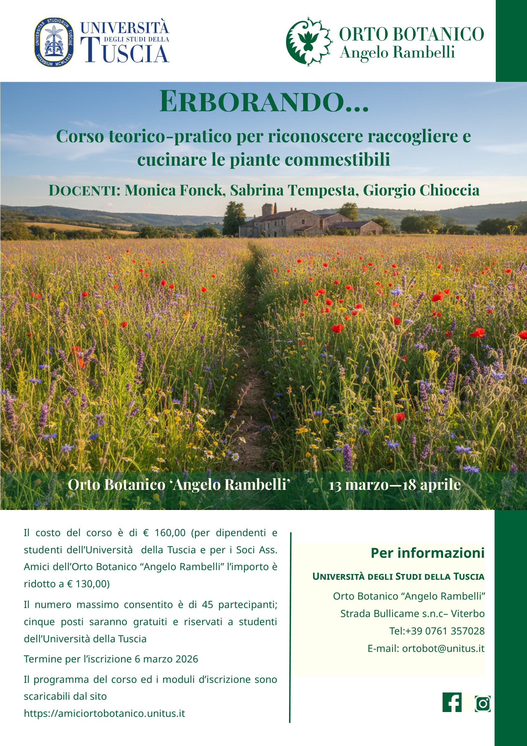 Il corso si articolerà in 9 incontri a partire da venerdì 13 marzo, tra teoria in aula e stimolanti uscite sul campo, sarà possibile acquisire le competenze essenziali per identificare con precisione le erbe spontanee commestibili e saperle distinguere da quelle tossiche o velenose. Questo percorso è stato pensato per tutti: per chi muove i primi passi e desidera imparare come raccogliere in modo sicuro e consapevole, per chi cerca un approfondimento sulle tecniche di riconoscimento.