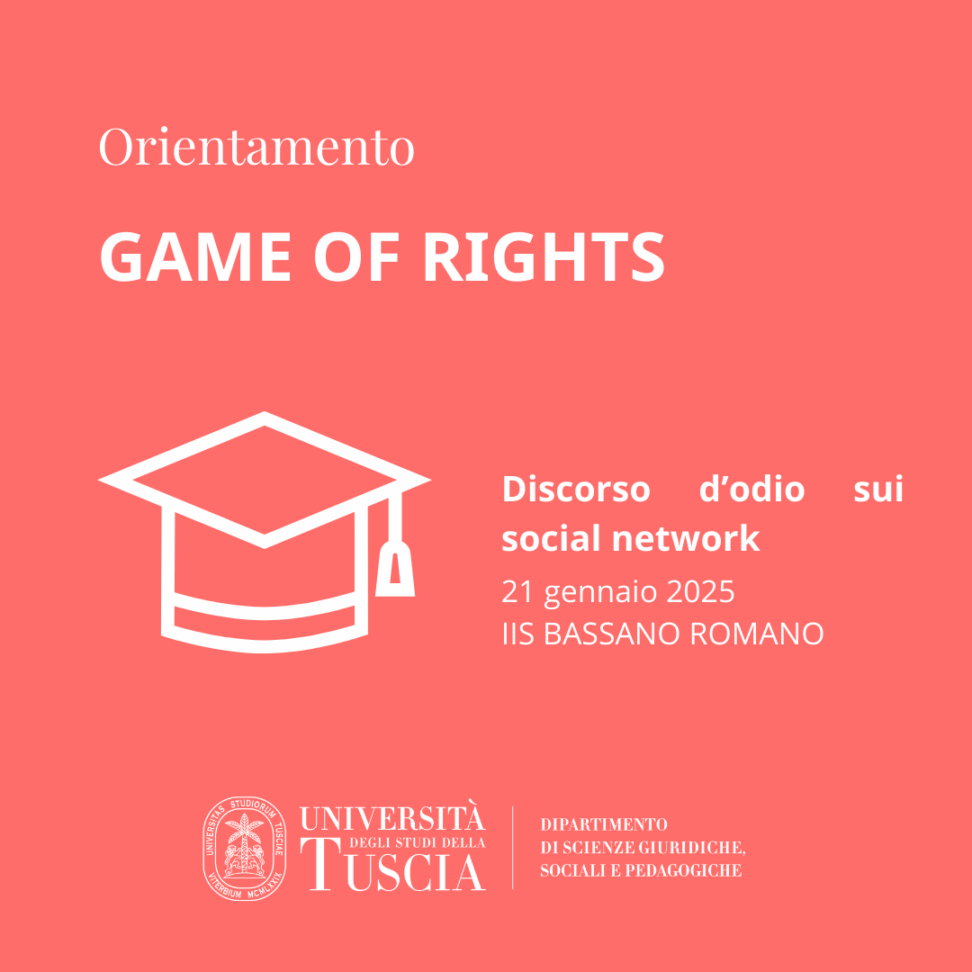Nel primo Game of Rights del 2025, che rientra tra le tante attività di orientamento del Dipartimento DIKE, il corso di Giurisprudenza ha incontrato gli studenti del Liceo delle Scienze Umane di Bassano Romano. Gli studenti si sono confrontati intorno a un tema molto attuale, ovvero quello del discorso d’odio sui social network. Tra dibattiti, scambi di idee e casi di studio, gli studenti dell’indirizzo socio-economico hanno animato la mattinata, argomentando le loro case history in maniera appassionante e coinvolgente.