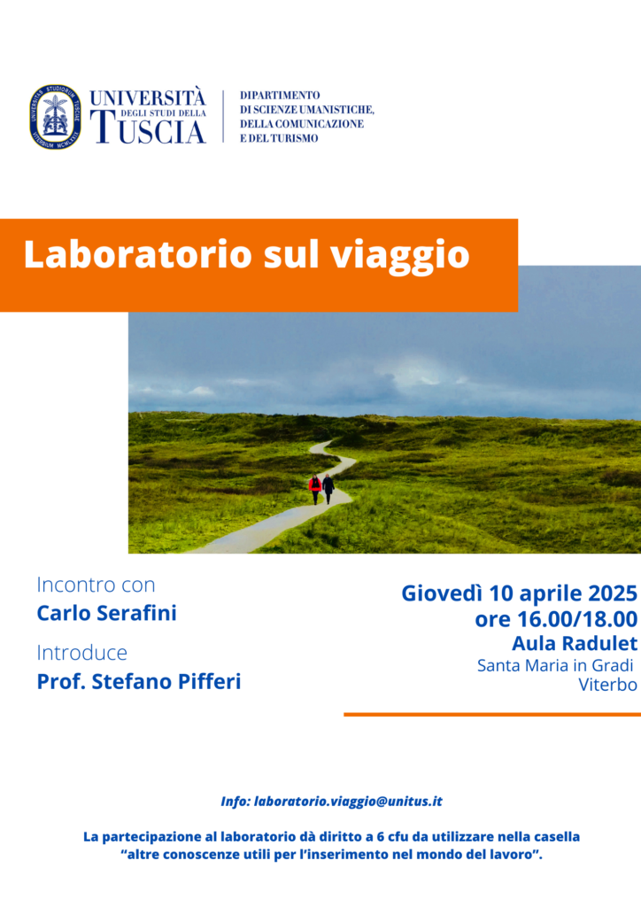 Proseguono con successo gli incontri del Laboratorio sul viaggio tenuti dal Dott. Stefano Pifferi nell’ambito del corso di laurea in Lettere Moderne. Gli incontri con giornalisti, scrittori e viaggiatori come Eraldo Affinati, Claudio Visentin della Scuola del Viaggio e Wu Ming 2 hanno toccato tematiche relative alla Tuscia come ideale spazio di attraversamento e di stratificazione memoriale, mostrando come il nostro territorio sia ricco di Storia e storie e di paesaggi, sia urbani che naturali, in alcuni casi da interpretare, in altri da (ri)scoprire che vedono nell’odeporica la modalità ideale di restituzione. Gli incontri proseguiranno in aprile in base al calendario disponibile sulla pagina del Laboratorio.