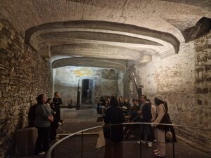 Nel pomeriggio, alle 15:00, ci siamo spostati nuovamente in pullman per raggiungere la Basilica di San Clemente. L’ultima tappa ci ha condotti in profondità, non solo fisicamente (la Basilica è costruita su più livelli di storia), ma anche nel cuore della cultura slava. Ancora una volta, con il supporto di due guide, abbiamo visitato la tomba di San Cirillo. Questa visita è stata cruciale per comprendere la figura di Cirillo che, affiancato nella missione dal fratello Metodio, ideò l’alfabeto glagolitico, precursore del cirillico. Visitare il luogo di riposo del santo ha trasformato la semplice conoscenza di un nome e di un alfabeto nella comprensione profonda delle radici della cultura slava, a cui l’alfabeto è dedicato dai suoi discepoli.