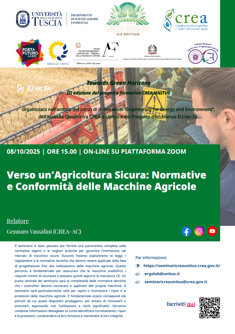 Il seminario è stato pensato per fornire una panoramica completa sulle normative vigenti e le migliori pratiche per garantire l’immissione nel mercato di macchine sicure. Durante l’evento, esploreremo le leggi, i regolamenti e le normative tecniche che devono essere applicate dalla fase di progettazione fino alla realizzazione delle macchine agricole. Questo percorso è fondamentale per assicurare che le macchine soddisfino i requisiti minimi di sicurezza e possano quindi apporre la marcatura CE. Un punto centrale del seminario sarà la complessità delle normative tecniche che i costruttori devono conoscere e applicare alle proprie macchine.