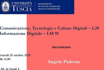 ContinuaSi comunica agli studenti del corso di laurea in Comunicazione, Tecnologie e Culture Digitali (L-20) che la lezione di mercoledì 19 novembre 2025 del Prof. Biggio, in Psicologia delle...