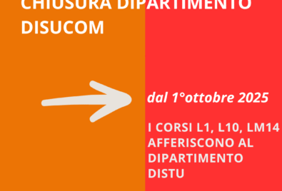 Si comunica ufficialmente agli studenti e al pubblico esterno che il Dipartimento DISUCOM dal giorno 1° ottobre cesserà. Vi invitiamo a seguire i nuovi canali DISTU per restare aggiornati su tutte...