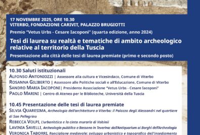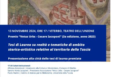 17 novembre 2025, ore 10.30Viterbo, Fondazione Carivit, Palazzo BrugiottiPremio "Premio "Vetus Urbs - Cesare Iacoponi" quarta edizione, anno 2024Tesi di laurea su realtà tematiche di...
