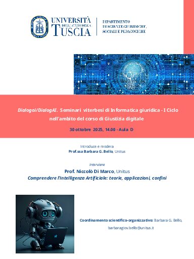 Il Ciclo nell’ambito del corso di Giustizia digitaleProposta seminariIntroduce e modera Prof.ssa Barbara G. Bello, Unitus30 ottobre - ore 14 -Aula D Comprendere l’Intelligenza...